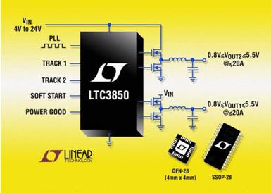 美国加利福尼亚州MILPITAS——2007年7月3日——Linear Technology Corporation宣布推出LTC3850产品,这是一种效率达到95%的双输出同步降压型开关稳压控制器,可驱动所有N通道功率MOSFET 级(使用同时和比率跟踪)。4V - 24V 输入范围涵盖了各种不同的应用,包括大多数中间总线电压和电池参数。强大的板载驱动器允许使用高功率外部MOSFET,可产生高达20A的输出电流,输出电压范围在0.8V至5.5V之间。应用领域包括笔记本电脑和平板电脑、便携式仪器、数据通信、电信、机顶盒、基站和多功能打印机,在这些应用中降压型DC/DC转换器必须提供高功率输出,同时具有较低热耗散和较小的尺寸。