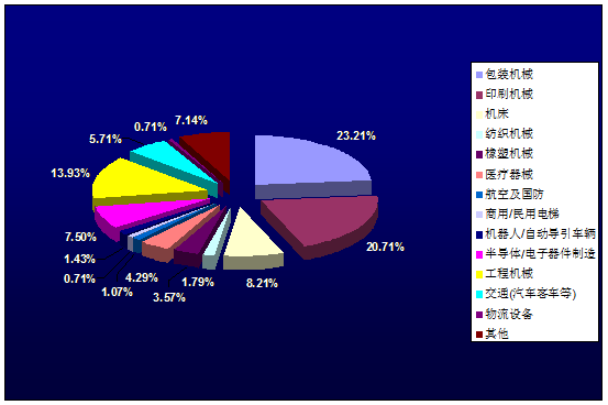 本次调查中发现OEM设备中自动化产品使用的宽度和深度都已大大拓展了。在合格的反馈者中,23.21%将OEM产品用于包装机械,20.71%的反馈者将其用于印刷机械,8.21%用于机床,用于工程机械的占13.93%,用于汽车、客车等交通设备的占7.14%,用于半导体/电子机械制造的占7.50%。