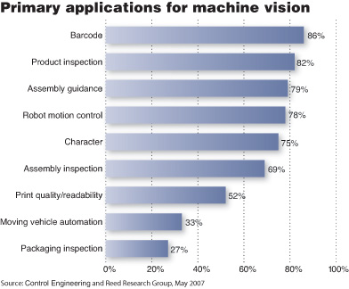 机器视觉的使用范围远远超出了质量控制。如下面的直方图所示,在被调查的对象中,读条形码、产品检验、装配驱动以及机器运行控制是最主要的运用。2007年的调查显示,机器视觉的使用率正逐步增加,随之而来的主要问题在于安装方面。毫不令人吃惊,30%的被调查者使用集成的机器视觉商帮助安装,而15%的未使用集成商的买家表示,他们计划在下一年采用集成商。我们同时发现,主要生产厂家(见下文)最新的机器视觉产品将重点放在了易用性上。