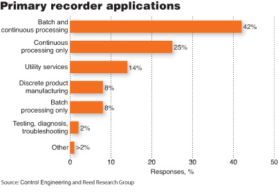 记录仪应用广泛。大多数用在批处理和连续流程中占42%。只有2%应用在测试,检验和故障分析。