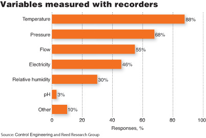 控制工程师最感兴趣的变量有:温度、压力、流量、物位和各种分析量(PH值,ORP等),这些值帮助跟踪和控制流程,确保质量,为许多工业问题提供文件。根据调查显示,大多数的记录仪用来测量温度、压力和流量,它们在连续或批处理的生产中大量应用。电气功率也经常被测量,因为它与过程变量息息相关。
