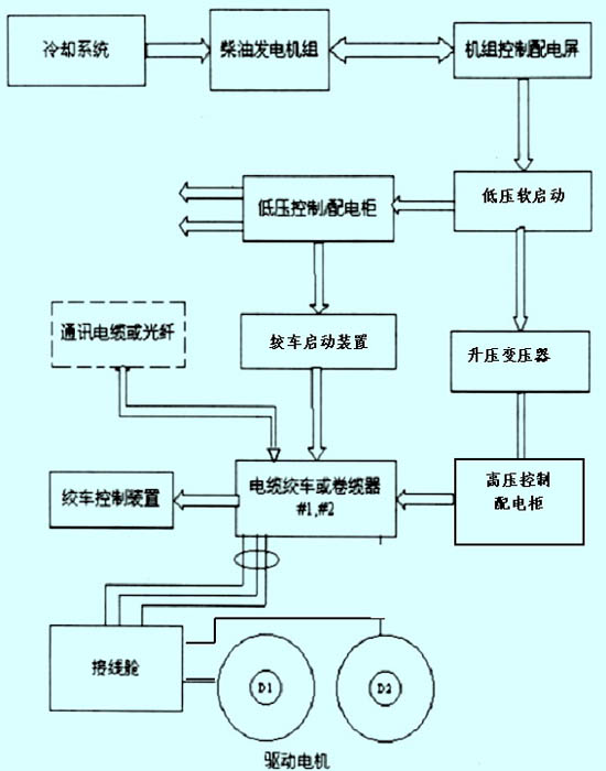 深海采矿车工作在6000m水下,为减小线路损耗采用3kv三相交流电给深海采矿车两台电机供电。动力来源是水面支持系统的柴油发电机组,柴油发电机组发出400v / 50hz三相交流电压,为减小造价,经多种设计方案进行比较,最终确定采用发电机组、低压软启动装置、升压隔离变压器到采矿车电机供电方式。这种技术方案既降低了线路损耗,也减小了传输电缆线径和重量,同时避开了高压变频,使得整套供电系统的可靠性和成本性价比大为提高。
