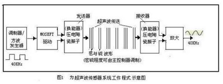 可选用国产TC40-167R系列或MA40S2S(发送传感器)、MA40S2R(接收传感器)超声波传感器.其主要参数为(以TC40-167R为例):标准频率40±0.1KHz;灵敏度(dB)≥-68;声压(dB)≥114;方向角(度)60;静电容量/pf-2500;工作温度(℃)- 20℃--+70℃;有效距离≥15M,反射接收有效距离为4M-7M.