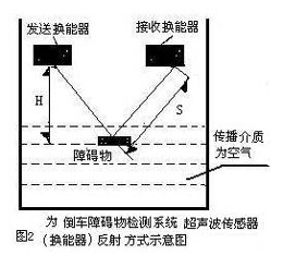 倒车捡测障碍糸统超声换能器的工作方式为反射式,,即发送传感器换能器发射40KHz频率的超声波,迂到障碍后反射被接收传感器的换能器接收并转换成电信号,见图2所示.