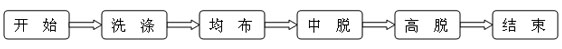 首先,加水,正反转洗涤25分钟,洗涤完毕后,排水,进入脱水阶段,脱水阶段包括均布、中脱和高脱三个过程,均布即是在有水和无水的情况下,以比洗涤过程高的转速正向旋转1.5分钟,使衣物均匀地附着在洗衣机的滚筒内侧,以使后续的脱水过程平稳;排水后,提高转速进入中速脱水过程(2分钟),随后再进入高速脱水过程(5分钟),使衣物的含水率降至所要求的水平。