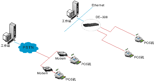 现客户采用新的方案(如上图右上图所示),银行信用业务主机可以直接通过城市广域网,以Ethernet方式访问DE-308下面连接的POS机。顾客使用POS机时,DE-308可以实时把收到的数据通过网络传向银行主机,而主机亦可快速回复收到的响应,对顾客做到高效、快捷的服务,并且受接入数量的影响较小,可最大限度的利用硬件的性能。
