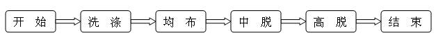首先,加水,正反转洗涤25分钟,洗涤完毕后,排水,进入脱水阶段,脱水阶段包括均布、中脱和高脱三个过程,均布即是在有水和无水的情况下,以比洗涤过程高的转速正向旋转1.5分钟,使衣物均匀地附着在洗衣机的滚筒内侧,以使后续的脱水过程平稳;排水后,提高转速进入中速脱水过程(2分钟),随后再进入高速脱水过程(5分钟),使衣物的含水率降至所要求的水平。