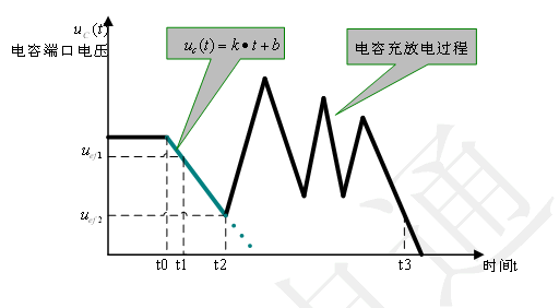 电容端口电压曲线分析参见图1。母线电压包络线衰落代表电机机械能量在刹车过程中转化衰减。母线电压锯齿曲线说明刹车过程中的间歇制动是根据电压准位值判定实现的。