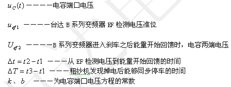 (3)满足系统需求的制约因素分析。 06-16检测电压准位,02-12减速时间与外部电容容量。06-16检测电压准位设定越高,则越有足够的能量保留,但是电压准位太高将无法满足粗纱机中电网正常电压偏低运行性能;02-12减速时间设置越短越有利停车,但是过短造成机械的震动;外部电容容量越大则越有利停车,但是过大则成本和体积就会随之增大。因此这三个方面要取一个适中的点。