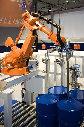 这项高精准的对象定位技术利用了模式匹配技术,可以读取和识别纷繁复杂的模式图案。挡块一旦定位,整条灌装线就开始启动。Robot Filler机器人第一个任务就是选择工具,调换制动鼓上的挡块螺母,放进托盘。接着,改换其他工具,夹选合适的灌装头。这是未来实现大型容器托板输送的自动灌装技术的一大创新举措。在没有人为介入的情况下,Robot Filler灌装设备带有快换机构,可以自动完成灌装头的换型,大大加速了灌装流程。另外,Robot Filler灌装设备有效保障了操作员在处理危险品的生命安全,因为整个灌装区域都是隔离开的。准完成确定量灌装后,