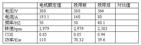 变频调速器投用后,控制回路的稳定性和可靠性比调节阀有明显提高,控制偏差保持在±1%以内,被控参数波动幅值较小。电机在变频调速器的控制下保持中速运行状态。在电机启动、控制过程中实行延时斜升、斜降,并且有输出短路、欠压、过流、过载过热等报警跳闸及在线故障诊断功能,保证其运行安全可靠,降低故障率,减少了设备损耗,尤其显著的是节能效果相当明显。在正常工况下,投用前后的电气参数如下: