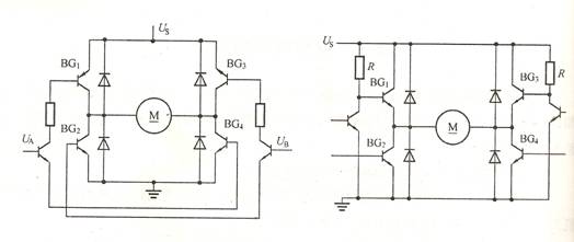 小功率驱动电路可以采用如图1所示的H桥开关电路。UA和UB是互补的双极性或单极性驱动信号,TTL电平。开关晶体管的耐压应大于1.5倍Us以上。由于大功率PNP晶体管价格高,难实现,所以这个电路只在小功率电机驱动中使用。当四个功率开关全用NPN晶体管时,需要解决两个上桥臂晶体管(BG1和BG3)的基极电平偏移问题。图2中H桥开关电路利用两个晶体管实现了上桥臂晶体管的电平偏移。但电阻R上的损耗较大,所以也只能在小功率电机驱动中使用。