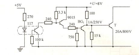 光电耦合器与后续电路结合就能构成前置驱动电路,如图5所示。这个前置驱动电路的上升延时tr——3.9μs,关断延时ts——1.6μs,可以在中等功率系统中使用。