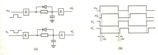 对H桥驱动电路上下桥臂功率晶体管加互补信号,由于带载情况下,晶体管的关断时间通常比开通时间长,这样,例如当下桥臂晶体管未及时关断,而上桥臂抢先开通时就出现所谓“桥臂直通”故障。桥臂直通时电流迅速变大,造成功率开关损坏。所以设置导通延时,是必不可少的。图6是导通延时电路及其波形。