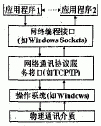 WindowsSockets提供给引用程序开发者一套简单的应用程序接口,应用程序调用其接口函数实现相互之间的通信。此外WindowsSockets又利用下层的网络通讯协议(如TCP/IP)功能和操作系统实现实际的通讯工作。它们之间的关系如图2所示。