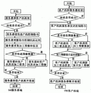 软件设计的关键是数据的网络传递,为了保证数据及时传递,在软件设计中采用了多线程技术,专门建立一个线程对采集的机床数据进行网络传递。该系统的流程图如图5所示。数控代码在客户机上编辑好之后,可以一次性传递给服务器,服务器将数控代码保存到内存中,然后在编译执行数控代码。控制指令的传递可以随时从客户机传递到服务器,服务器接到指令后立即执行。对于机床加工图像和状态参数的传递则要复杂一些。在服务器上,数控系统通过CCD摄像头实时采集加工图像,利用定时器在每一个周期内将图像保存为位图文件,然后将位图文件通过网络传递到客户机上,客户机在接收完每一个位图文件后,用定时器在每一个周期在图像显示窗口进行刷新显示,使加工图像保持连续性。同时服务器上的数控系统实时采集机床状态参数,利用定时器每一个周期将以一定格式的数据传递到客户机,客户机对数据进行接收后分析,再用定时器在一个周期内对状态参数进行更新显示。为了避免位图数据和参数数据在传递时的混乱现象,在服务器端采用中断方法,在传递图像数据时中断参数数据的传递,等图像数据传递完之后再传递参数数据,这样就很好的解决了在数据传递过程中的占用通道的矛盾问题。