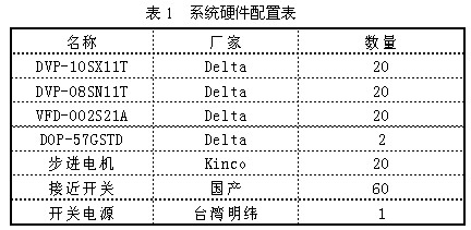 现在以设备的左右两边各20头的退火一边为例(另一边相同),系统框图如图1所示。系统中的硬件设备选型,如可编程控制器,步进电机、接近开关和开关电源等如表1 所示。