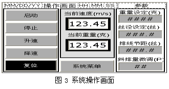 控制工艺及要求可概括如下:(1)退火速度最高达到15m/s以上,退火丝径:1.03-6丝;(2)退火的线速度恒定;(3)启动、停车要平稳,不能断丝;(4)排线要均匀,不能中间高两头低或中间低两头高;(5)斜排量要精确,启动时排线从右极限开始向左极限运行,当运行至左极限,排线电机立即反向向右极限运行;(6)自动停车的功能,当实际收线的重量大于或等于在人机上设定的重量后,自动停车,同时保证定排线和收线电机同步减速停止,保证张力的恒定,不能断丝;(7)能实时根据材料密度,收线速度,运行时间计算出当前收线的重量,在人机上显示。