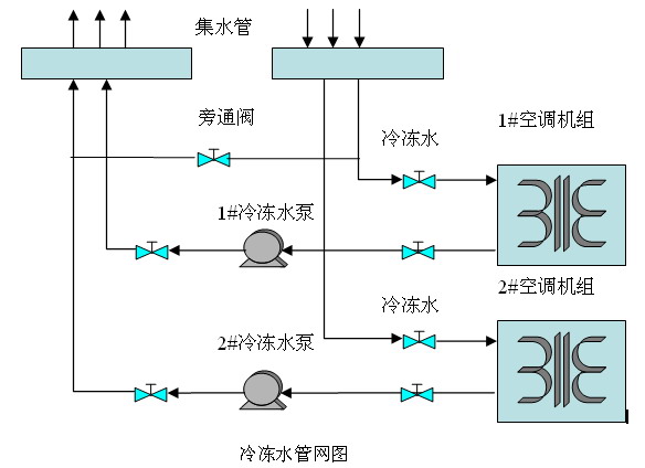 当1#机组开起后,1#流量必须满足最低流量值200 m3/h,如果用户流量没有达到最低流量值时,机组就会停机保护,值班人员必须提前打开旁通阀,使部分冷冻水在机组内循环来保证机组内有200 m3/h以上的流量。2#也如此。