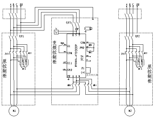 系统采用工变频互备,另外可以灵活的选择需变频的电机是1#还是2#由KM3、KM4来完成。