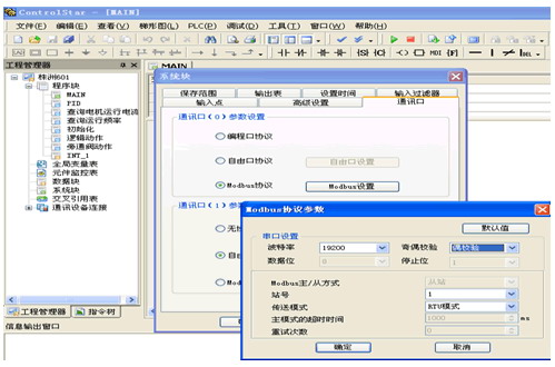 EC20的COM0与EVIEW人机界面通过MODBUS协议进行通讯,COM1通讯口与艾默生的EV2000变频器进行自由协议通讯,PLC软件设置: