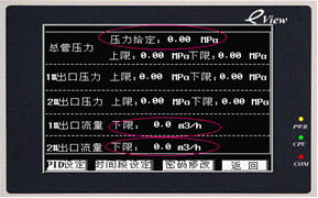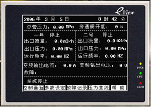(1)友好的人机界面:由于系统需对每台机组的进口压力、出口压力、出口流量、总压力的上限值和下限值,PID参数进行设置,还要对所有的压力、流量值进行显示,还有报警信息进行记录。采用Eview的MT506LV人机界面。界面编辑了“主画面”、“控制画面”、“参数设置”、“故障记录”、“压力曲线”、“帮助”六个基本画面。主画面上对采集的压力、流量值、变频器的运行频率、电流进行显示,还显示系统当前状态和故障显示,让用户一目了然。