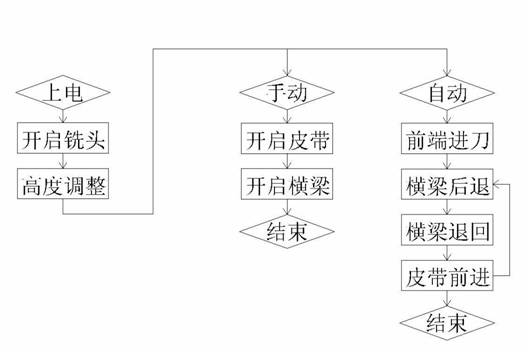首先按照工艺要求,调整好三个滚刀的垂直高度;启动三个动力头,开启横梁和皮带;板材在皮带的带动下,作断续运动;皮带移动一次到位后,横梁带动滚刀由后向前铣削,然后快速退回,周而复始,直至板材加工完成。