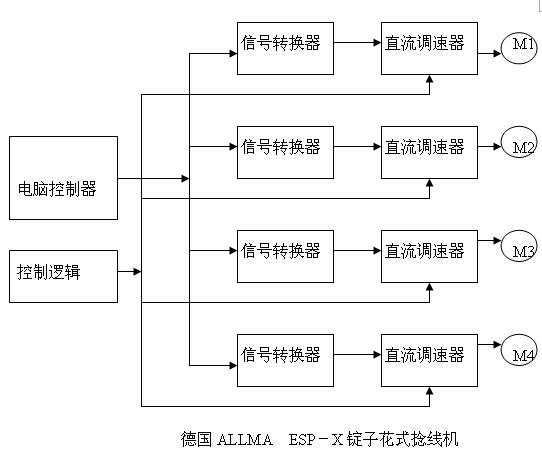 M1为喂入罗拉驱动电机,M2为前罗拉驱动电机,M3输出罗拉驱动电机,M4为锭子驱动电机。这些电机都是直流电机,每一个电机都有专门的鼓风冷却系统,直流调速器和直流电机都是德国伦茨公司提供的产品。