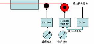 分析:如果不考虑上述限制条件,上述工艺通过一个非常普通的中心收卷方案就可以解决。因为艾默生有专门针对此类工艺的TD3300张力控制专用变频器,可是TD3300变频器三种张力控制方式所要求的条件(张力反馈信号或张力开环闭环矢量转矩模式)均不具备。为此,我们为厂家提供了如下的解决方案,并得到了厂家认可。