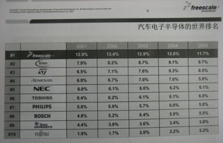 随着汽车电子行业的迅速发展,越来越多的公司希望在这个领域能够谋得一份属于自己的丰厚利润。但面临这种僧多粥少的局面,只有更好地提高自身产品性能才能立于不败之地。从演讲着提供的这份近五年的汽车电子半导体的世界排名表中,能够非常直观地看出,飞思卡尔公司的市场占有率一直都稳居第一,以02年的份额来看,该公司的市场占有率相较第二名竟有5.2%之多,足可见其产品性能优势。