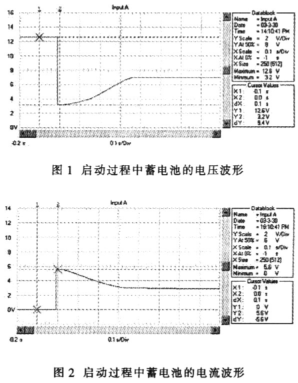 超级电容器与蓄电池并联时,汽车启动过程的电压波形如图4所示,电流波形如图5所示。与图1和图2相比,启动瞬间电压跌落由只采用蓄电池时的3.2V提升到7.2V;启动电流从560 A提高到l200 A;启动瞬时的电源输出功率从2 kW上升到8.7kW;启动过程的平稳电压由7 V提高到9.4 V;启动过程的平稳电流由280 A提高到440 A;启动过程的电源平稳输出功率从2.44 kW提高到4.12 kW。