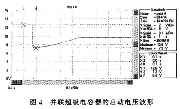 超级电容器与蓄电池并联时,由于超级电容器的等效串联电阻(ESR)远低于蓄电池的内阻,因此,在启动瞬间,1 200 A启动电流中的800 A电流由超级电容器提供,蓄电池仅提供400 A的电流,明显低于仅采用蓄电池的560 A,有效降低了蓄电池极板的极化,阻止了蓄电池内阻的上升,使启动过程的平稳电压得到提高。最为重要的是蓄电池极板极化的减轻不仅有利于延长蓄电池的使用寿命,而且也可以消除频繁启动对蓄电池寿命的影响。