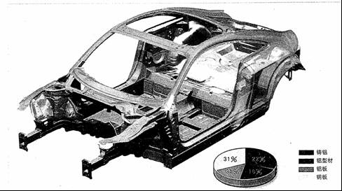 整个复合材料车架构件中,31%的铝合金材料是板材,22%的是铸造铝合金材料,16%的是挤压性型材。在局部受力较大和局部传递受力的部位以及有多种功能要求的部位都采用了铸造铝合金构件。这些铸造的铝合金零部件有着最佳的几何形状以承受碰撞受到的力量和传递受力,同时也能充分有效地利用空间。另外,所有的铸铝件都有着合适的连接尺寸和连接功能,因此,无需其它的附,也不需要双重的连接操作即可完成连接。最好的例子是轿车的A立柱连接节点——它除了与车架纵梁、车门门槛相互连接外,还将A立柱和TT轿车的车窗下横梁连接在一起。