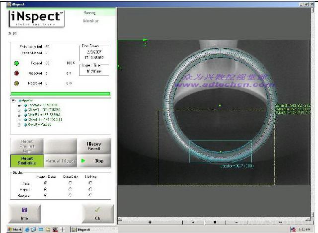 此时采用的是9MM镜头和红色DOAL光。通过定位工具和测量工具能正确测量出瓶口的内径和外径。对于变形和瑕疵也能准确判断。