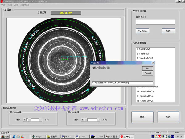 (2) 光盘由机器臂放置到检测位置后由感应开关控制启动检测系统工作,系统读取印刷条形码和ID字符