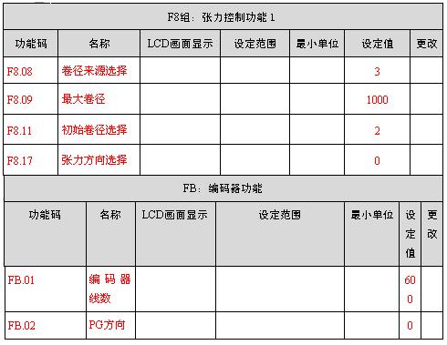 (3)在程序中设定空芯卷径和最大卷径的数值。通过前面卷径计算的公式算出电机尾部所加编码器产生的最大脉冲量(P2)和最低脉冲量(P2)。通过算出的最大脉冲量对收卷电机的速度进行限定,因为变频器用作张力控制时,如果不对最高速进行限定,一旦出现断纱等情况,收卷电机会飞车的。最低脉冲量是为了避免收卷变频器运行在2Hz以下,因为变频器在2Hz以下运行时,电机的转矩特性很差,会出现抖动的现象。