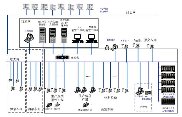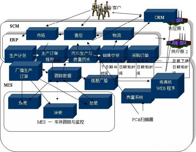 作为汽车厂运营管理系统的一部分,MES系统与SCM、CRM、ERP等系统一起,协助管理企业的各项经营业务。