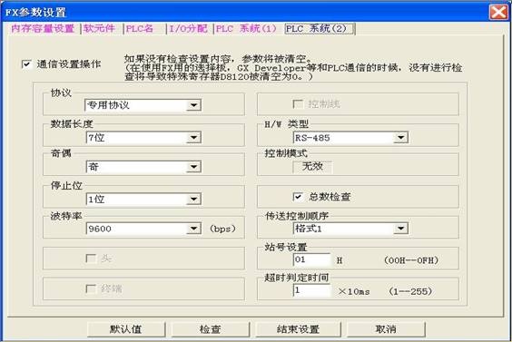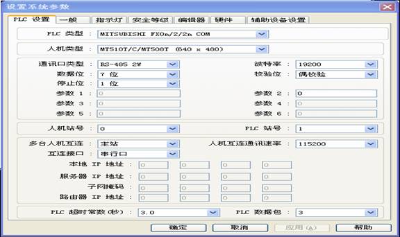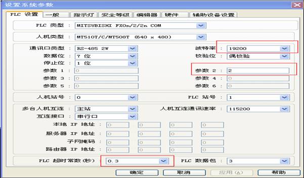 触摸屏的参数设置在对波特率、接线方式、奇偶校验要保持一致;在站号设置方面在触摸屏要写的站号只写1到6台中的一个站号就可以了;通过BD连接多台要选择MITSUBISHI FXON/2/2N COM 的驱动;最重要的一点是要在系统参数编译器选项菜单下;地址模式选择相应的扩展模式。具体的参数的设置参考下图3: