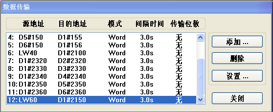 在触摸屏这边主要组态三个模式;在三个模式里触摸屏需要通过数据传输将不同PLC里的数据通过触摸屏的数据传输功能把PLC里的数据读到触摸屏里的相应数据区;然后通过宏指令通过算数运算然后,再通过数据传输将相关的数据传输到的相应的PLC的数据区;在这里为了提高触摸屏读取数据的数度;我们建议不管是触摸屏还是PLC读取连续数据区的数据;这样有助于提高通讯速率。相关的设置如下: