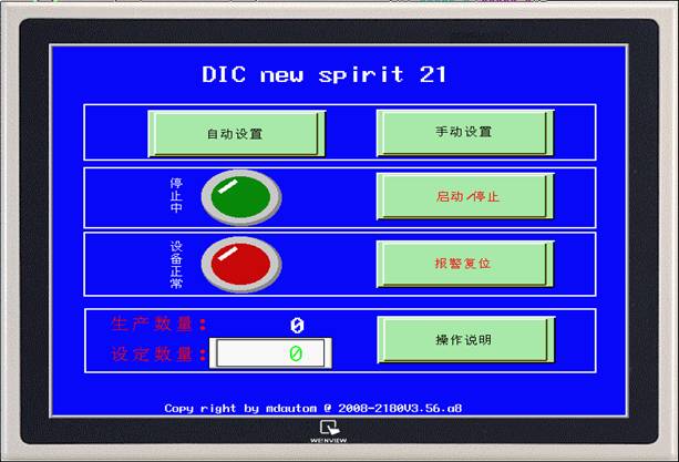 当程序启动以后画面首先进入主页面;当进入主页面以后;首先,在没有报警的情况下启动主电机;如果有报警要对报警进行报警复位后在进行操作然后对生产产品的数量进行设置。然后根据客户的需求可以进行自动控制和手动控制的选择,而且在启动画面还有相关的操作说明,对操作员起到引导作用。