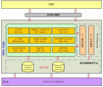 宜宾天原MES系统采用中控软件的流程工业MES解决方案MES-Suite,建立以物料流为主线,以生产调度管理、工艺管理、设备管理为基础,梳理企业生产过程的业务活动,基于全流程的物流跟踪和全生命周期的设备管理,为宜宾天原提供一个规范、高效、统一的业务信息集成与应用平台。系统总体架构如图1所示。