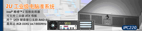 【2008年3月20日(四)北京讯】持续致力于研发创新工业计算机产品的领导厂商 - 艾讯股份有限公司 (AXIOMTEK Co., Ltd.),隆重推出一款全新高性能 2U 工业级机架型准系统 IPC220,支持 LGA775 构架 Intel® 酷睿™2 双核处理器,采用 Intel® Q965+ICH8DO 高速芯片组,以及 ATX 规格标准工业级母板;这是一款完整且一次到位的高级准系统,可让使用者立即安装软件省去硬件兼容性测试,并配备 2 组 PCI 插槽的转接卡,以便未来进行系统扩展。