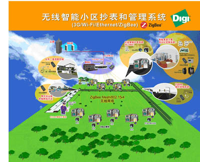 第二届MeteringChina2008于2008 年4 月22-24 日在美丽的海滨城市-珠海即将拉开帷幕,作为ZigBee 联盟成员的Digi International将现场为您呈现Digi完美的解决方案“无线智能小区抄表和管理系统”。此方案采用了Digi 公司的Drop-in Networking解决方案,利用3G/Wi-Fi/Ehternet/ZigBee 的混合网络,实现了自动化的远程数据采集和社区监控功能。该解决方案以下子系统包括(如图):