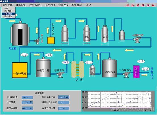 该系统为反渗透纯水系统,包括一级反渗透、二级反渗透。主要控制系统有原水阀、原水泵、、一级高压泵、一级纯水泵、二级纯水泵等,输入监控点有两个电导率、2个流量、2个PH值、一个水箱液位、1个温度点以及故障信号等。