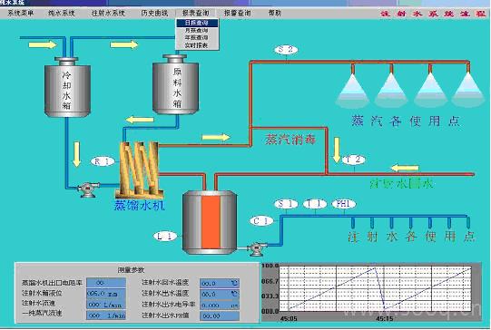 实时监控:动态显示水箱的液位、阀泵的开/关状态等,模拟水流、水质、温度,PH值、液位、阀泵的开关状态、模拟水流、水质的情况自动控制泵阀的开关、流量的大小和出口回流等。