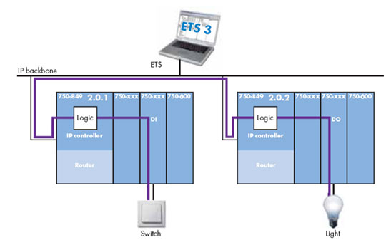 WAGO KNXnet/IP控制器与KNX/EIB/TP1模块一起在IP网络中作为一个路由器使用。ETS3工具软件连接在以太网上,可以访问所有通过KNX/EIB/TP1模块连接到TP1网络上的设备。在TP1网络左侧的设备通过IP网络可以与TP1网络右侧的设备进行通讯。