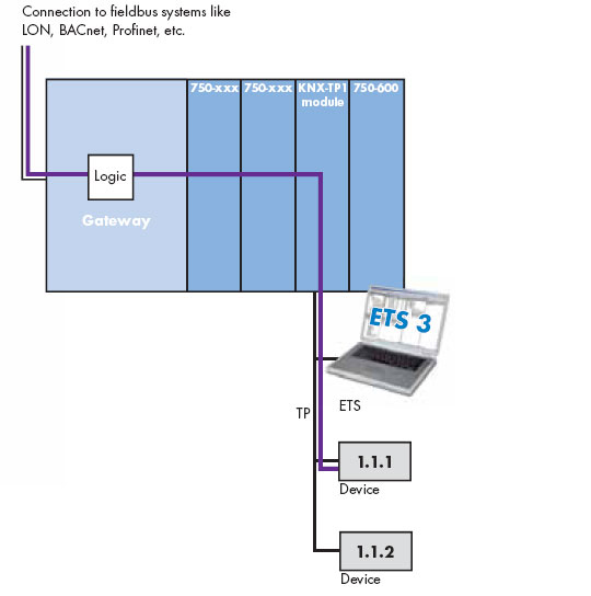 KNX/EIB/TP1模块并没有用于KNXnet/IP控制器,而是与WAGO750系列其他现场总线控制器相连使用。在这种情况下,KNX/EIB/TP1模块用做网关使用。ETS 软件工具被连接到TP1 网络。