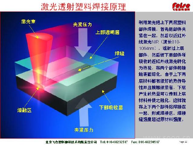 利用激光把两件塑料部件焊接,首先把部件夹紧在一起,然后以近红外线激光NIR(波长810-1064nm),透射过第一个部件,然后被第二个部件吸收所,所吸收的近红外线激光化为热能,将两个部件的接触表面熔化,形成焊接区。这种焊接方法,能够造出超过原材料强度的焊接缝。