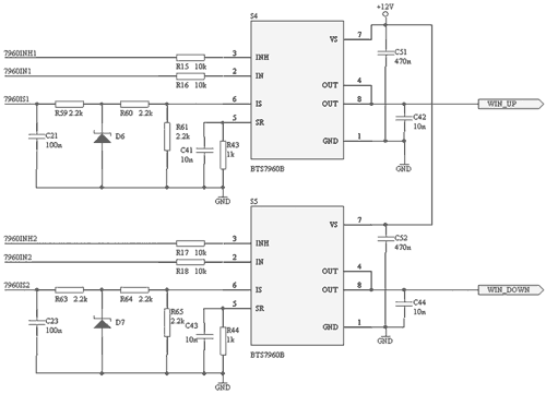 电动车窗部分,在硬件上通过BTS7960驱动直流电机转动,使窗上升或下降。采用两片BTS7960B构成全桥工作。