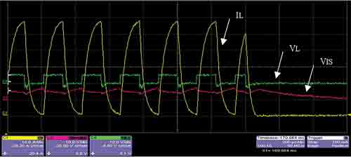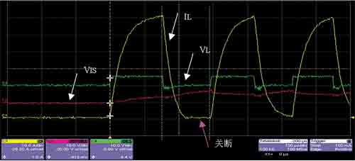 BTS7960短路故障实验的实验条件如下:+12.45V电池电压,+5V电源供电,2.0m短路导线(R=0.2Ω),横截面积为0.75 mm,连接1kΩ电阻和一个发光二极管。V S与电池正极间导线长1.5m(R=0.15Ω)。如图5所示,其中V IS是IS引脚对地的电压、V L是OUT引脚对地电压,I L为发生对地短路故障时,流过BTS7960的短路电流。